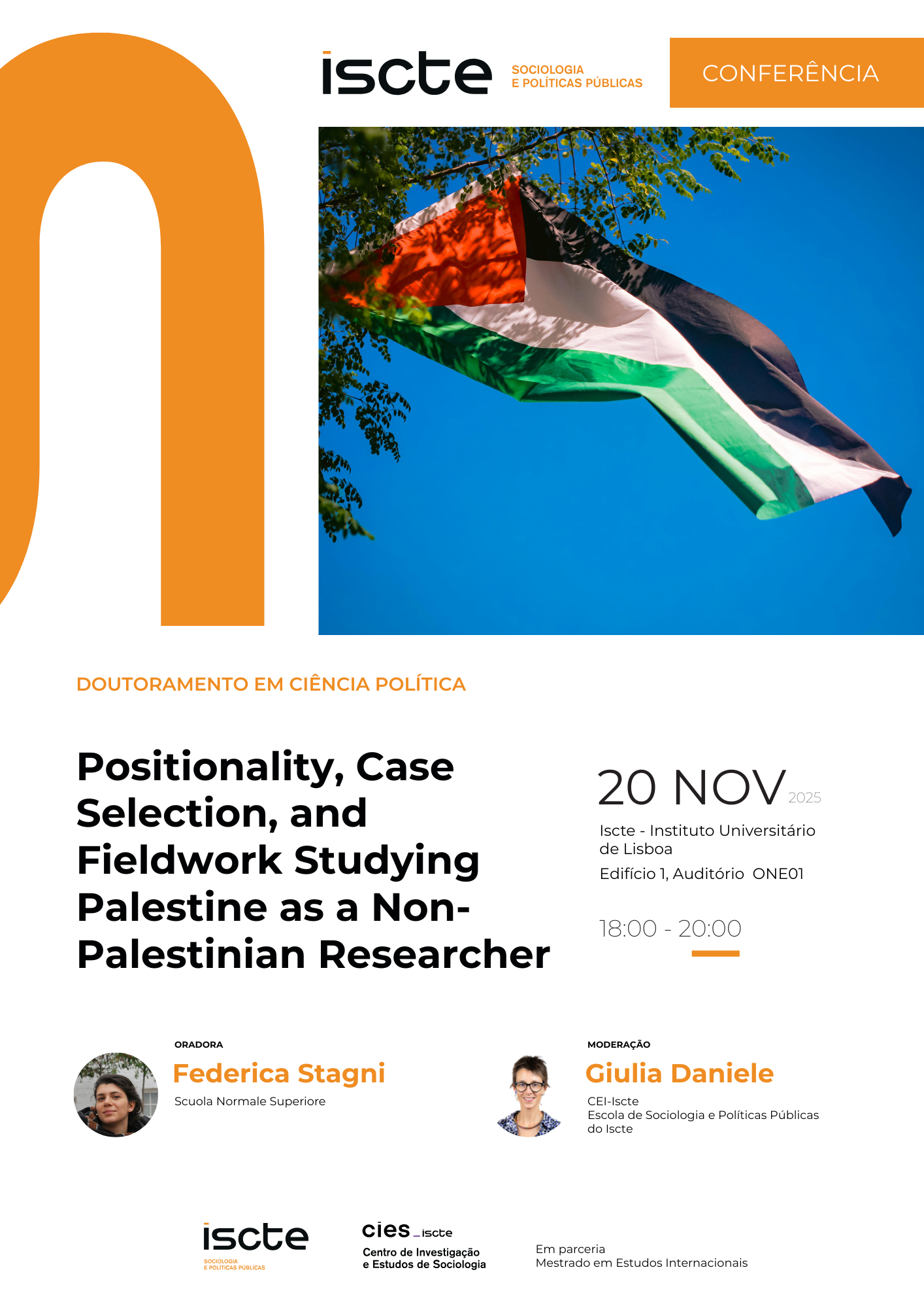 A conferência doutoral em Ciência Política dedicada à temática "Positionality, Case Selection, and Fieldwork Studying Palestine as a Non-Palestinian Researcher", decorre no dia 20 de novembro 2025, a partir das 18h00 no Auditório ONE01, no Ed.1 do Iscte.