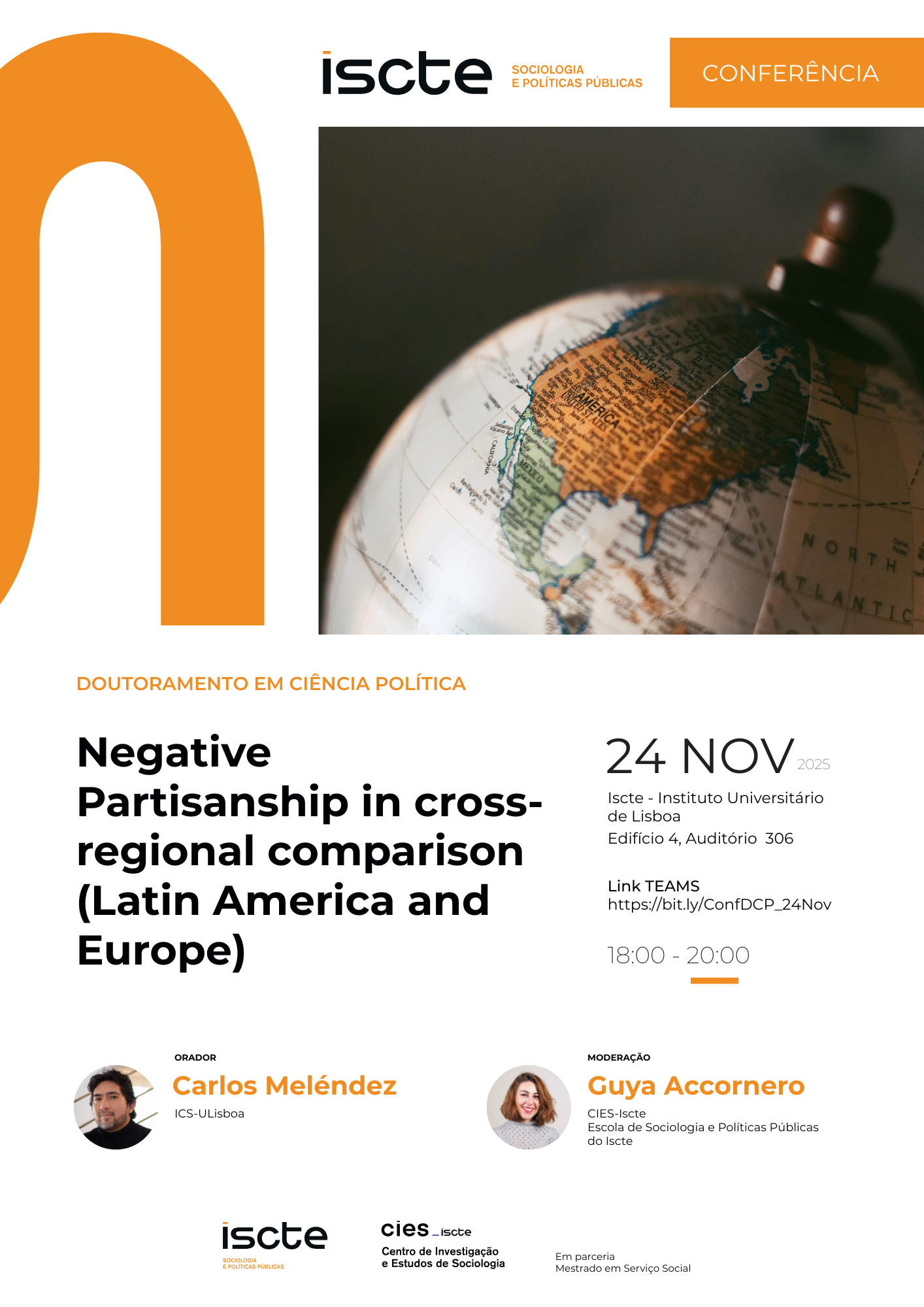 A Conferência no âmbito do Doutoramento em Ciência Política "Negative Partisanship in cross-reginal comparison (Latin America and Europe)", decorre no dia 24 de novembro de 2025, no Ausitório 306 do Ed.4 do Iscte - Instituto Universitário de Lisboa.