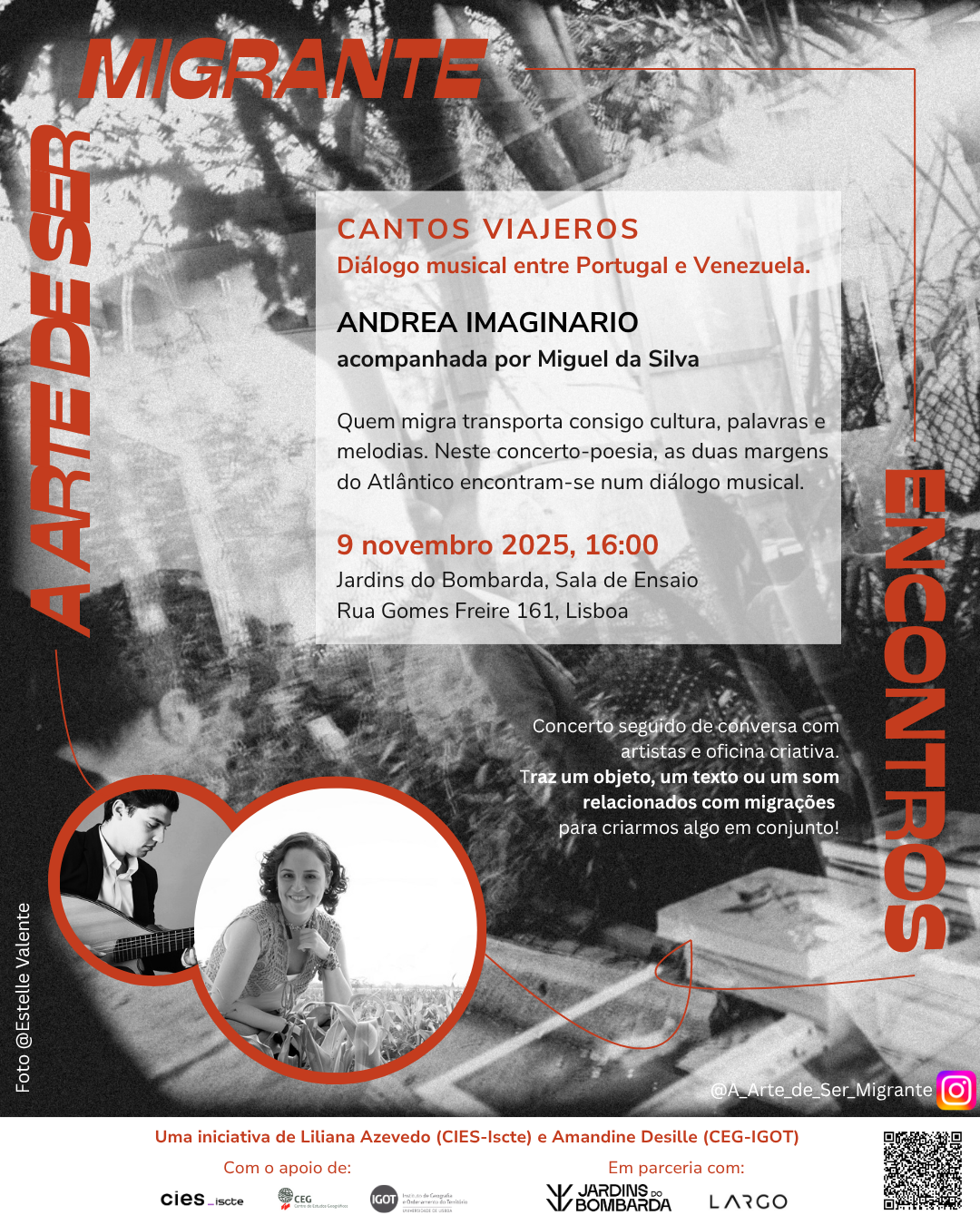 A viagem marca a vida da pessoa migrante. A sua bagagem não é apenas um repertório de objetos, mas também de ideias, sons e palavras que habitam a mente de quem viaja e que, no seu destino, devem abrir espaço para outros novos. Assim como na palavra, o diálogo na música também se torna necessário, e é isso que este concerto deseja representar, um diálogo musical que conduz às relações interculturais entre duas heranças: a portuguesa e a venezuelana, cruzadas em caminhos de ida e volta dos músicos Andrea Imaginário e Miguel da Silva. A poesia será a protagonista de cada som explorado, desde Pessoa e Camões relembrados nas Caraíbas, até os venezuelanos Andrés Eloy Blanco e Henry Martínez envolvidos na saudade portuguesa.