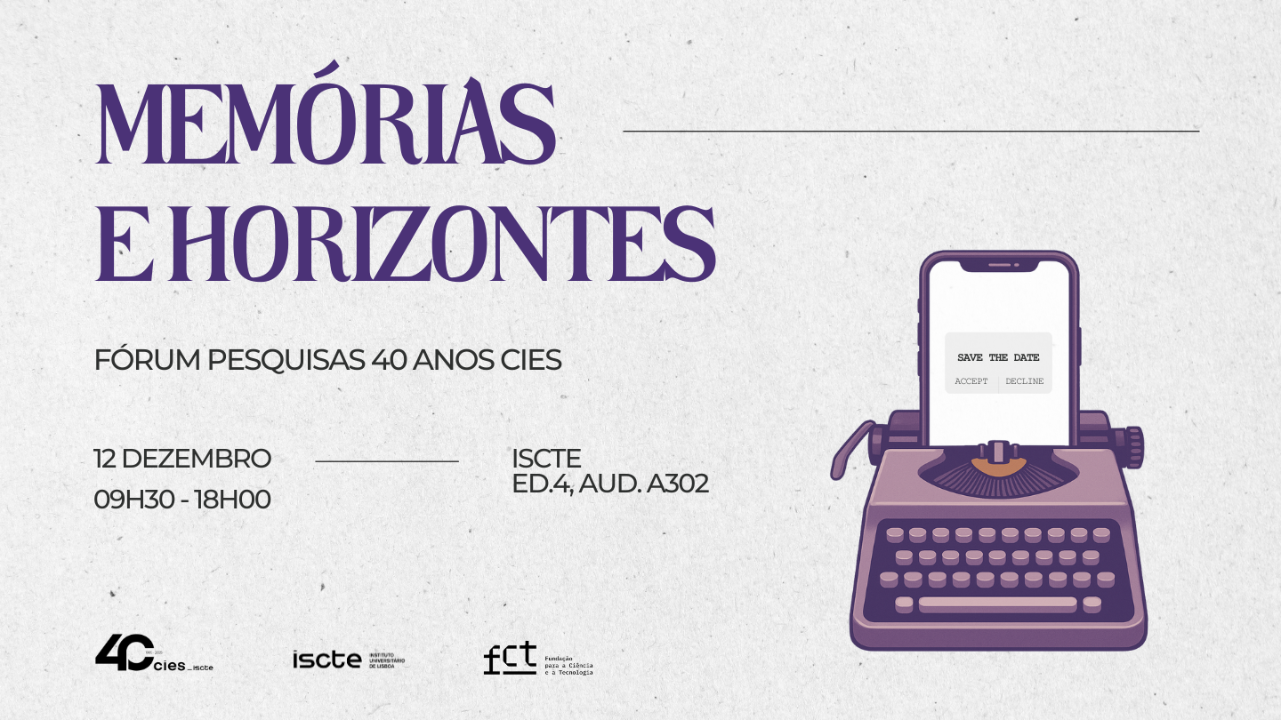 No âmbito das comemorações dos 40 anos do CIES, terá lugar no dia 12 de dezembro de 2025 o Fórum Pesquisas dedicado aos "40 Anos CIES: Memórias e Horizontes", um encontro que revisita o percurso do Centro, celebra os seus legados e projeta os desafios futuros.