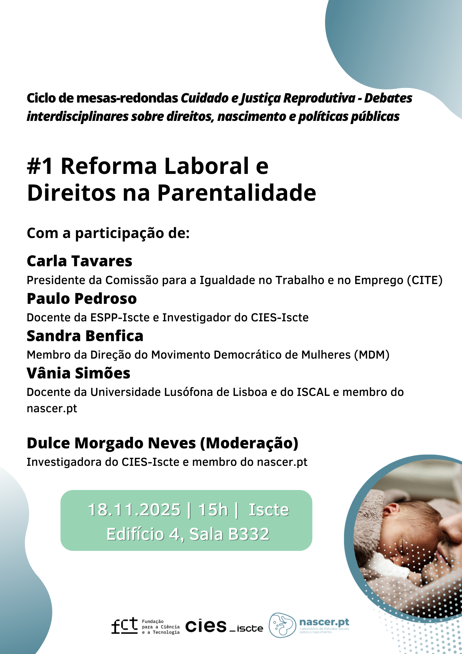 A primeira sessão deste ciclo, intitulada Reforma Laboral e Direitos na Parentalidade, vai acontecer já no dia 18 de novembro de 2025, às 15h, no Iscte, Edifício 4, Sala B332 (Clube CVTT).