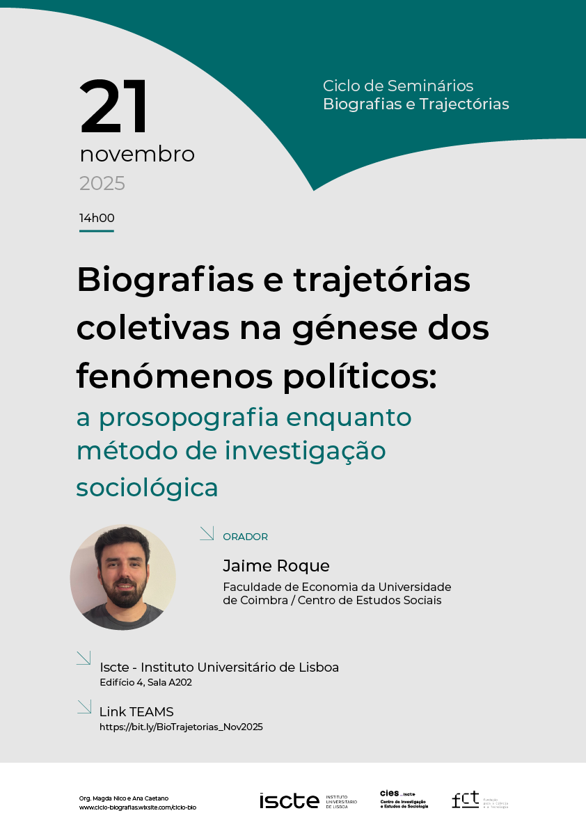 O próximo Seminário do Ciclo Biografias e Trajetórias decorre no dia 21 de novembro 2025, a partir das 14h, com o tema "Biografias e trajetórias coletivas na génese dos fenómenos políticos: a prosopografia enquanto método de investigação sociológica", em formato hibrído.