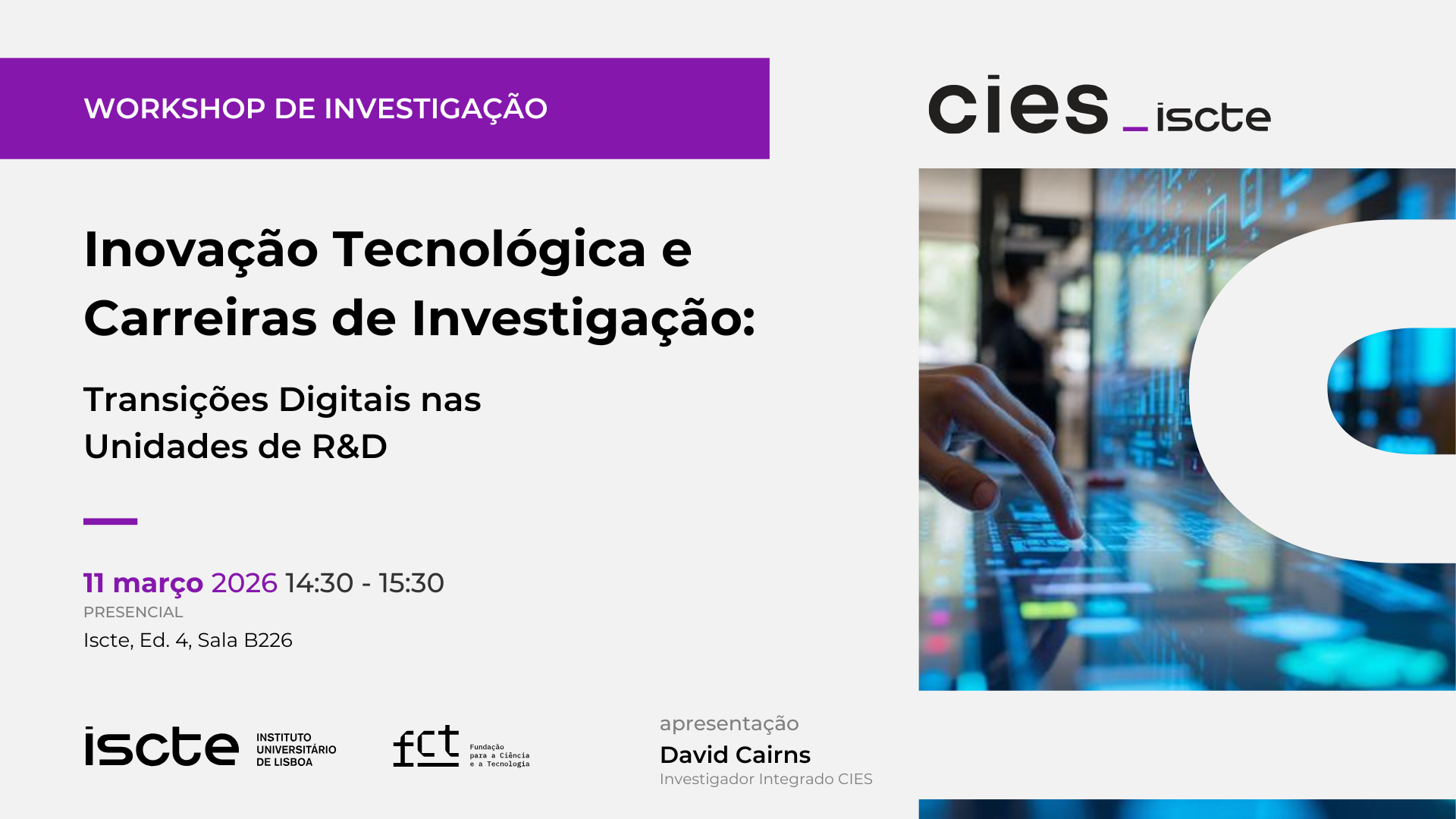 O próximo workshop de investigação decorre no dia 11 de março de 2026, na sala B226 do edifício 4 do Iscte - Instituto Universitário de Lisboa. Este workshop dedicado ao tema da "Inovação Tecnológica e Carreiras de Investigação: Transições Digitais nas Unidades de R&D", será conduzido pelo investigador do CIES, David Cairns.
