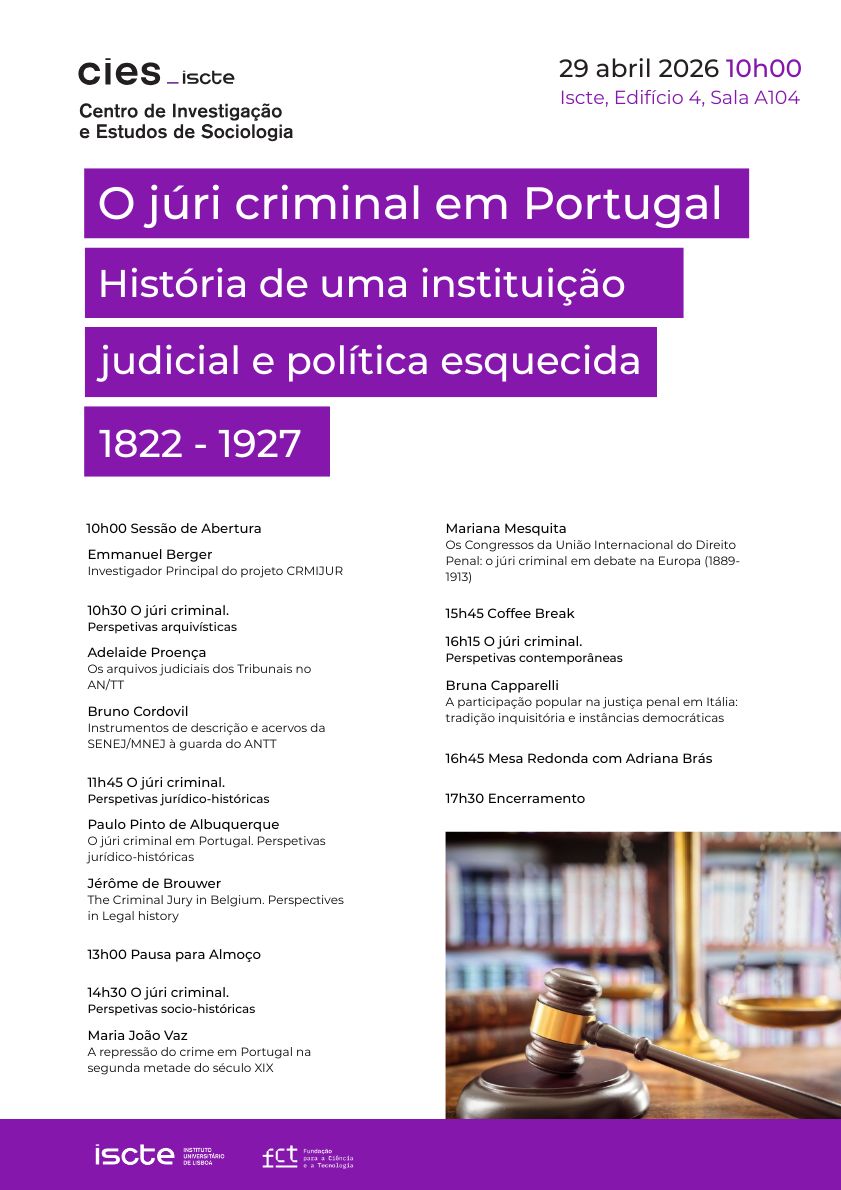 No dia 29 de abril 2026, o CIES fará a apresentação pública do projeto CRIMJUR – O júri criminal em Portugal. História de uma instituição judicial e política esquecida (1822–1927), liderado pelo investigador Emmanuel Berger.