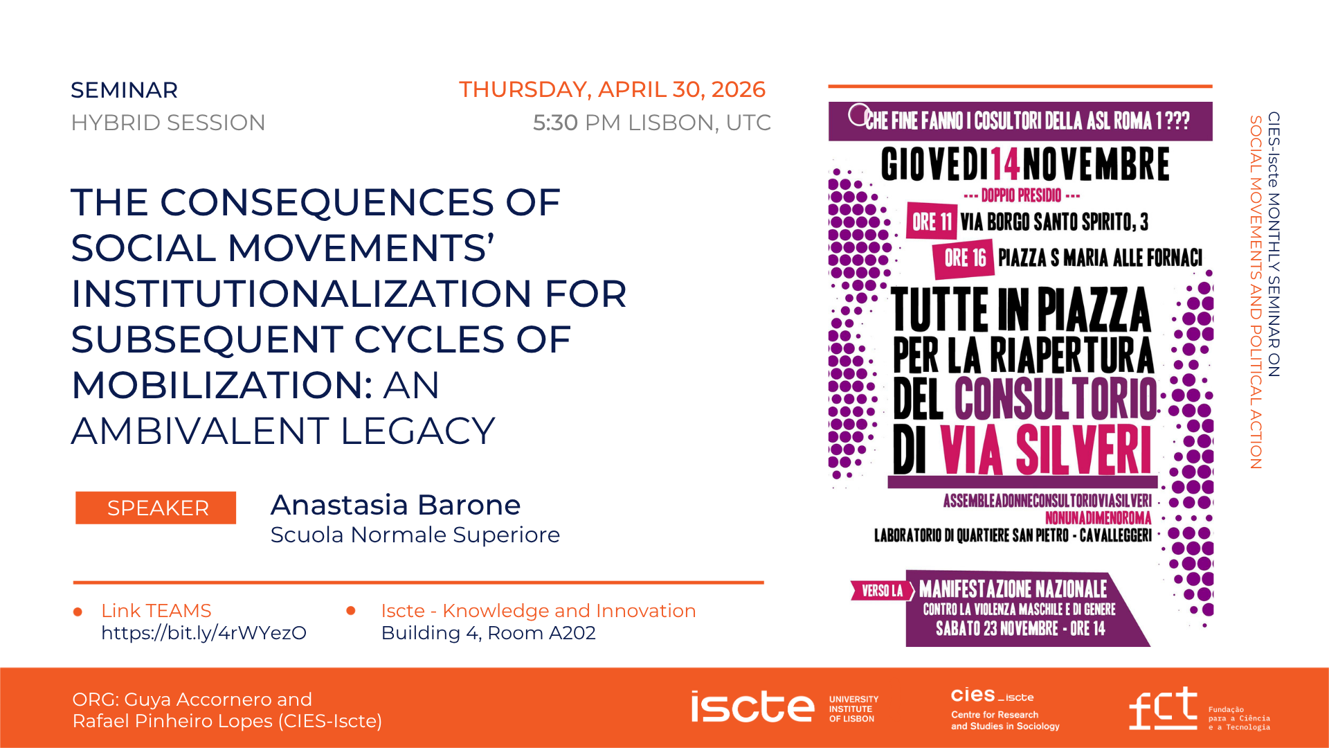 Integrado no Ciclo Mensal de Seminários de Movimentos Sociais e Ação Política, o próximo seminário com o título "The Consequences of Social Movements' Institutionalization for subsequent cycles of mobilization: An ambivalent legacy", decorre a 30 de abril, pelas 17h30, num formato híbrido.