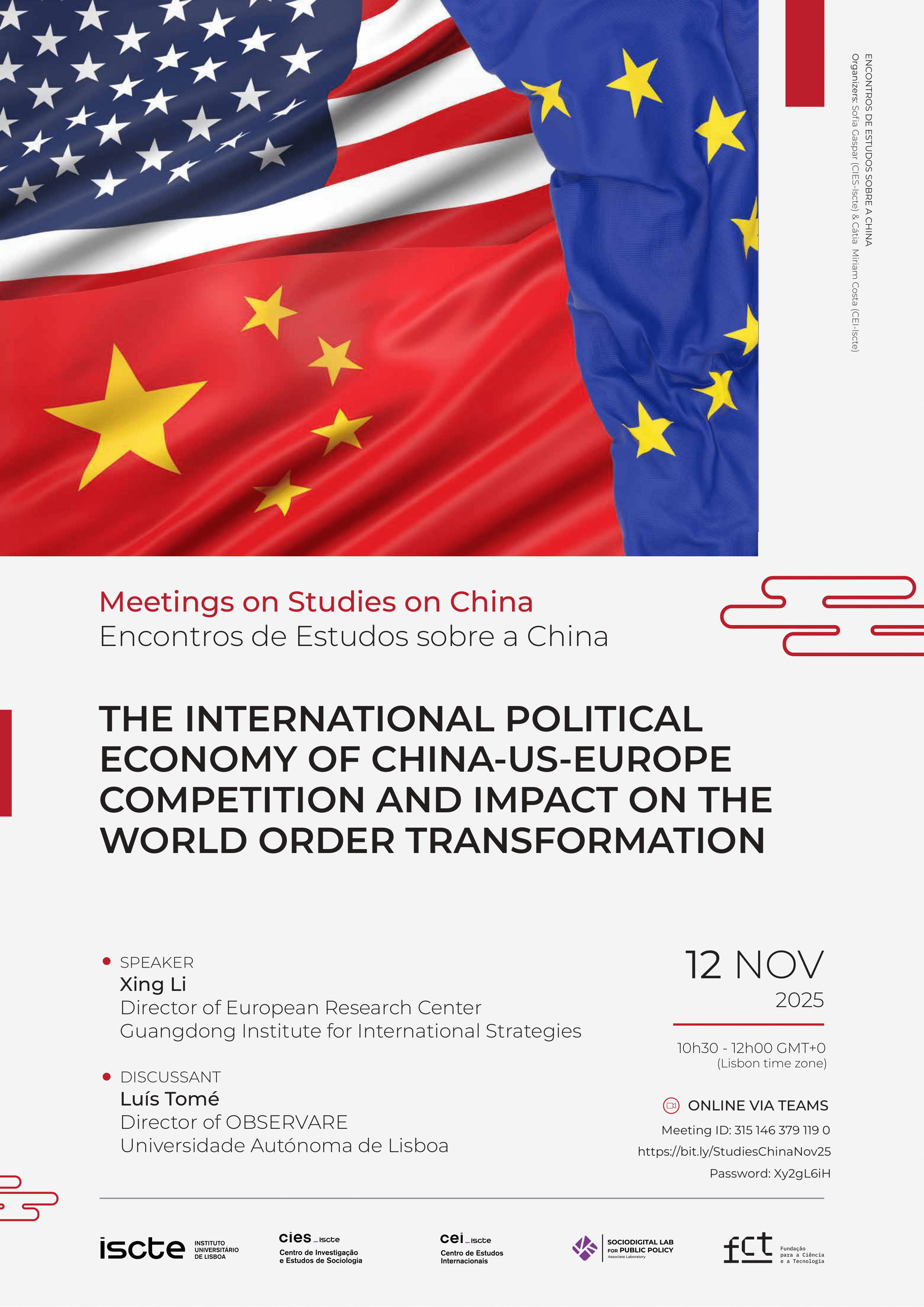 The next Meeting on Studies on China returns on the morning of November 12, 2025, between 10:30 a.m. and 12:00 p.m., dedicated to the theme “The International Political Economy Of China-US-Europe Competition And Impact On The World Order Transformation.”