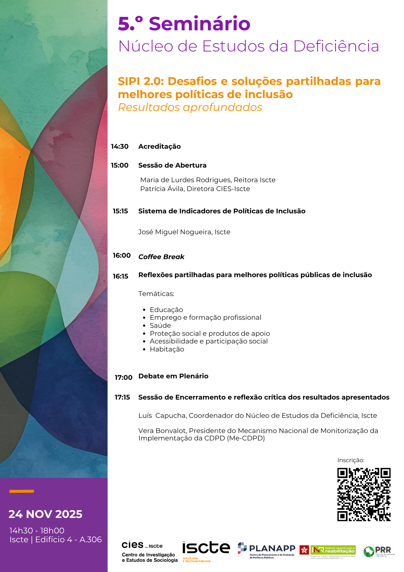Following the seminar presenting the preliminary results of the project “Sistema de Indicadores de Políticas de Inclusão” and responding to a challenge posed by various stakeholders, the Núcleo de Estudos da Deficiência will hold its 5th seminar - “SIPI 2.0: Desafios e soluções partilhadas para melhores políticas de inclusão.”