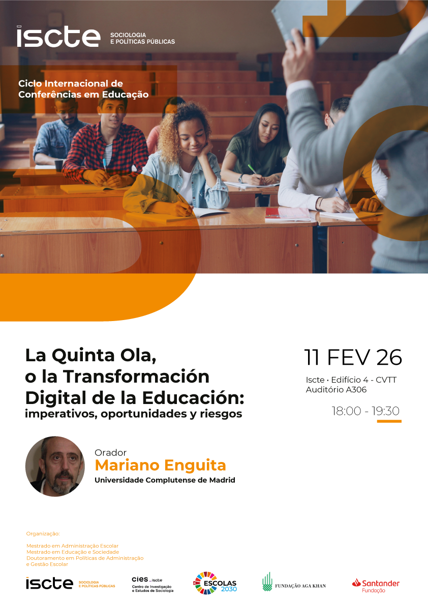 The next conference of the International Conference Cycle in Education will take place on February 11, 2026, from 6:00 p.m. to 7:30 p.m., at Iscte – University Institute of Lisbon.