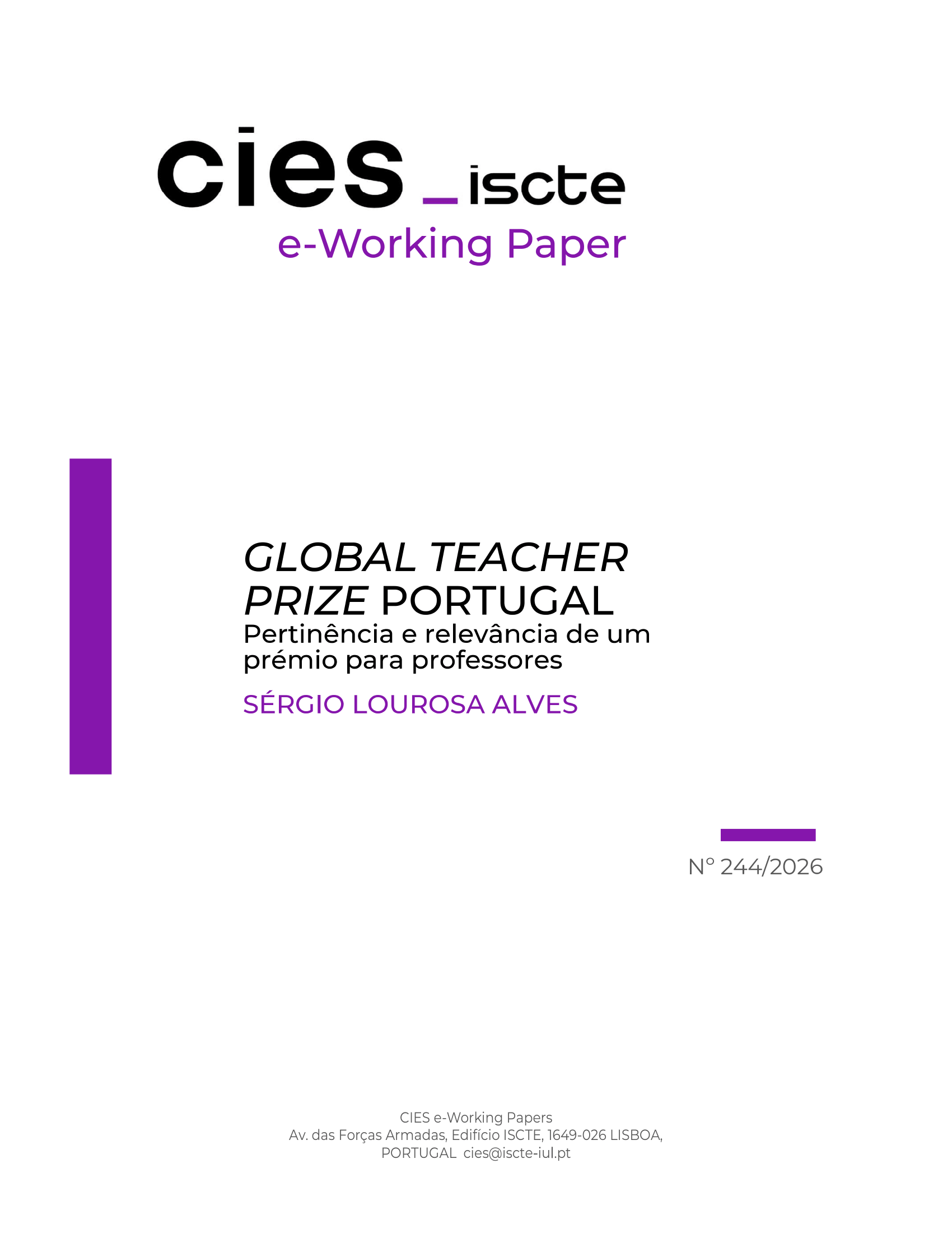 The latest CIES e-Working Paper is now available in Open Access. Entitled “Global Teacher Prize Portugal: Pertinence and Relevance of an Award for Teachers”, the publication is authored by Sérgio Lourosa Alves, a PhD candidate in Educational Administration and School Management Policies at Iscte – University Institute of Lisbon.