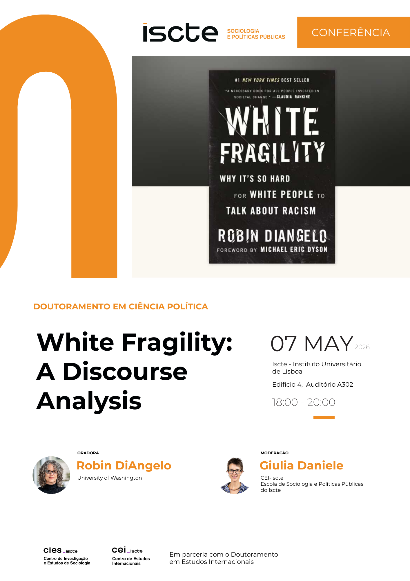 The PhD program in Political Science, in partnership with the PhD program in International Studies, is pleased to host the doctoral conference entitled "White Fragility: A Discourse Analysis", to be held on the afternoon of May 7, 2026, at Iscte.